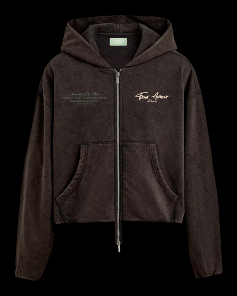 • On the left chest, subtle text in script font references"Faux Amour Paris", serving as a minimalist luxury signature.• On the right chest, faint green writing adds an intellectual, art-inspired statement - a nod to da Vincislegacy of blending art with philosophy.